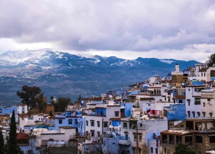 Scenic view of Chefchaouen, Morocco, showcasing its iconic blue buildings, ideal for travel in spring or fall. with our Morocco Tours